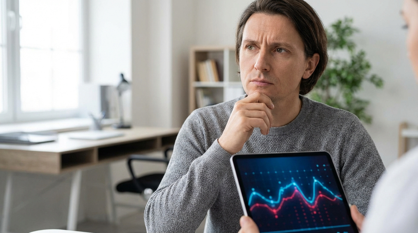Un homme pensif regarde l'écran d'une tablette montrant un graphique de données médicales, lors d'une consultation.