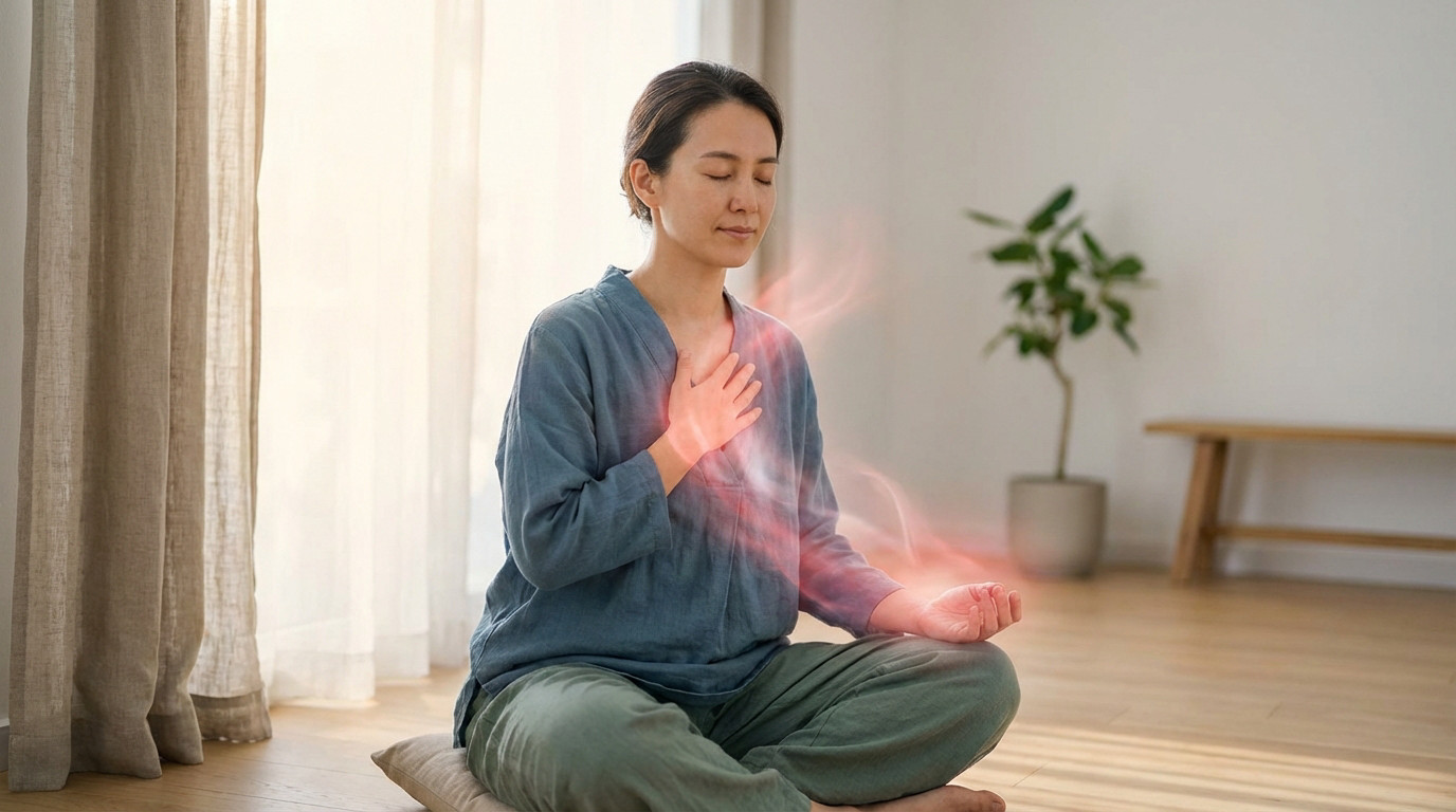 A person meditates in a serene room, eyes closed, hand on chest, with red energy flowing from their heart. Diffused light.