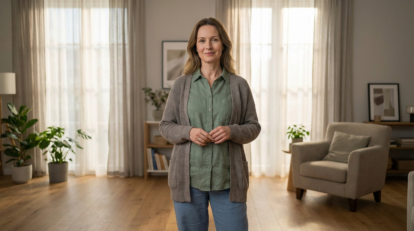 Portrait d'une femme souriante, d'âge mûr, vêtue d'un cardigan marron et d'une chemise verte, dans un salon lumineux avec plantes.