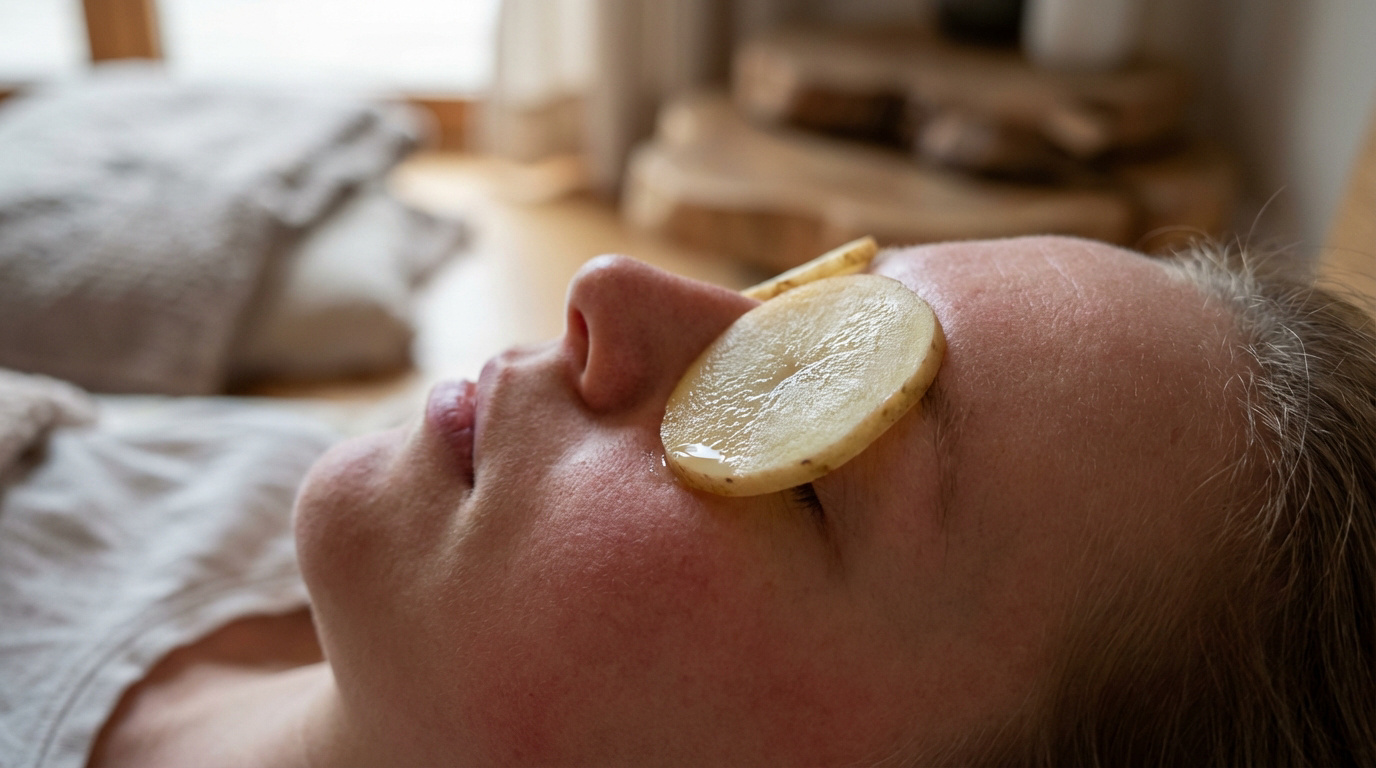 Gros plan sur une personne allongée, avec des rondelles de pomme de terre posées sur les yeux, pour un soin naturel.