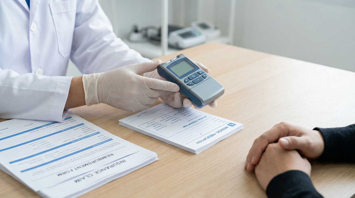 Professional hands in gloves present a TENS device to a patient. Medical prescription and reimbursement forms are on the desk.