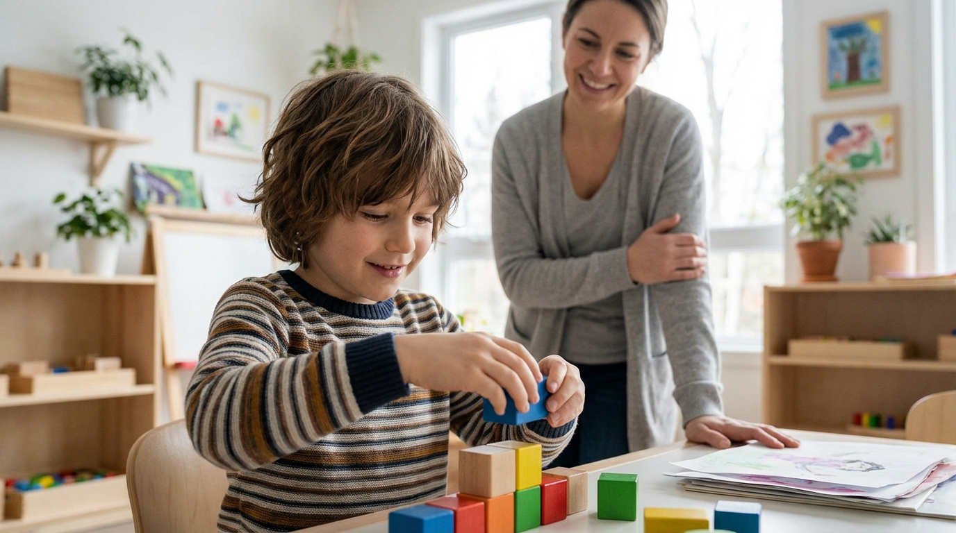 Un jeune garçon souriant empile des blocs colorés, supervisé par une femme bienveillante dans une salle de classe lumineuse.